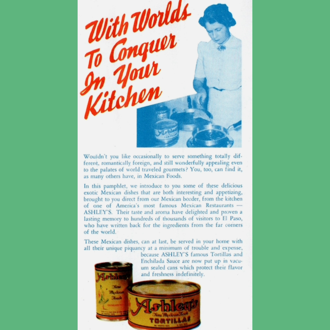 Possibly a watershed moment in Mexican American food history happened in 1938, when Ashley, Inc. won a contract to feed the servicemen at Fort Bliss. The foods became wildly popular on base. The servicemen’s endorsement was an All-American stamp of approval, legitimizing Mexican foods like mashed beans and “Spanish” rice while simultaneously helping diffuse them around the country. (A major Ashley innovation was canned tortillas, which made the food travel-friendly and shippable). Ashley would eventually supply about half of the tortillas to El Paso’s retail market, according to the El Paso Times. By the 1950s, it was canning 20 Mexican food products, including canned enchiladas, several sauces, green chiles, and various bean preparations, and exporting products to Hong Kong, China, Venezuela, the Phillippines, and South America.